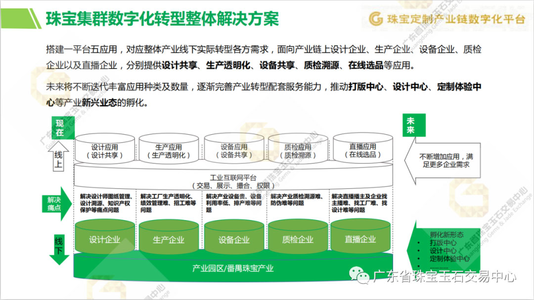 珠寶產(chǎn)業(yè)集群數(shù)字化轉(zhuǎn)型項(xiàng)目由廣州市工業(yè)和信息化局指導(dǎo),廣東省珠寶玉石交易中心牽頭、聯(lián)合行業(yè)企業(yè)共建,打造聯(lián)通珠寶原料采購、珠寶設(shè)計(jì)、加工、質(zhì)檢、銷售等珠寶全產(chǎn)業(yè)鏈以及人才、定制體驗(yàn)、直播等全業(yè)態(tài)的珠寶產(chǎn)業(yè)專項(xiàng)服務(wù)體系,通過提供共享設(shè)計(jì)應(yīng)用、生產(chǎn)透明化應(yīng)用、設(shè)備共享應(yīng)用、質(zhì)檢應(yīng)用、直播應(yīng)用五大應(yīng)用以及承載五大應(yīng)用的工業(yè)互聯(lián)網(wǎng)平臺(tái),構(gòu)建完整產(chǎn)業(yè)數(shù)字化轉(zhuǎn)型服務(wù)鏈條體系。