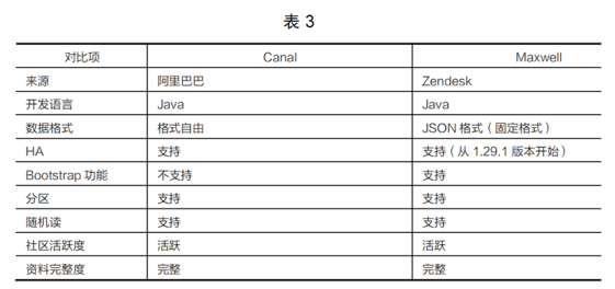 ● Cannal和Maxwell常用于關(guān)系型數(shù)據(jù)庫實時數(shù)據(jù)采集,它們之間的細(xì)節(jié)區(qū)別見表3: