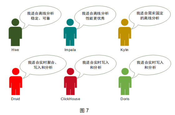 數(shù)據(jù)分析技術(shù)框架包括Hive、Impala、Kylin、Clickhouse、Druid、Drois等,它們的典型應(yīng)用場景如圖7所示。