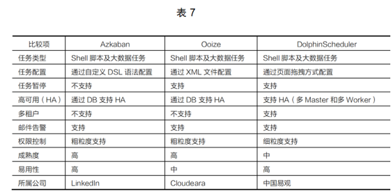 包括Azkaban、Ooize、DolphinScheduler等。它們適用于普通定時執(zhí)行的例行化任務(wù),以及包含復(fù)雜依賴關(guān)系的多級任務(wù)進(jìn)行調(diào)度,支持分布式,保證調(diào)度系統(tǒng)的性能和穩(wěn)定性,它們之間的區(qū)別見表7。