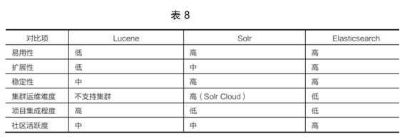 在選擇全文檢索引擎工具時,可以從易用性、擴(kuò)展性、穩(wěn)定性、集群運(yùn)維難度、項目集成程度、社區(qū)活躍度這幾個方面進(jìn)行對比。Lucene、Solr和Elasticsearch的對比見表8。