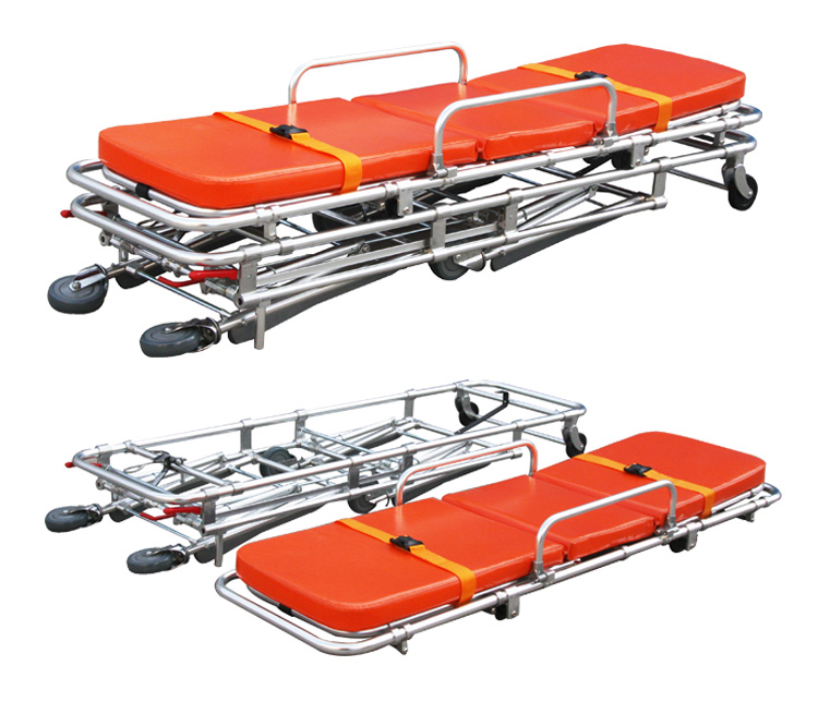 采用高質(zhì)鋁合金材料,配接件鋁合金壓鑄。采用海綿軟墊,使傷病員躺臥舒適。折腿機械結構,通過左右手柄控制。僅需一名救護人員把病人推上救護車。固定支架與救護車相固定,擔架通過滑道上車后可鎖定。擔架可分離,可以快速搶救病人。